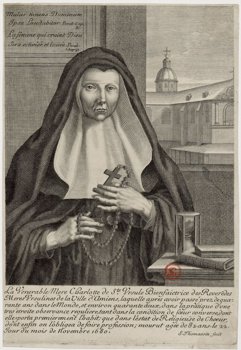 La Venerable Mere Charlotte de Ste Ursule Bienfaictrice des Reverendes Meres Ursulines de la ville d'Amiens, gravure au burin par Simon Thomassin (1655-1733). Cote : EST 94 RES (P.103b)